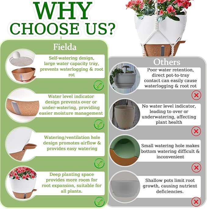- 【Never Over/Underwater Again!】Fielda's indoor hanging planters feature an EXCLUSIVE WATER WINDOW in the base tray - instantly check moisture levels without guesswork! Protect your plants from dehydration and promote healthy root systems with this visual watering guide. Perfect for hanging pots for indoor plants enthusiasts who value scientific plant care.
