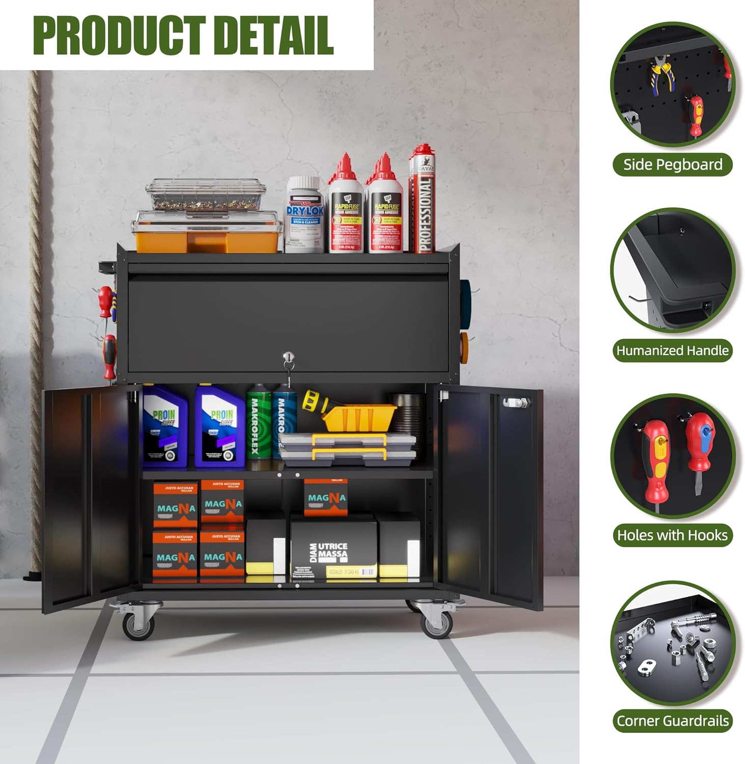 - 【Select High-Quality Steel】Garage storage cabinet with wheels is made of cold-rolled steel. The reinforced structural design and high-quality metal materials provide the garage cabinets with good stability and load-bearing capacity. The tool storage cabinet also uses high-quality powder spraying, with a smooth surface, anti-rust, and easy to clean.