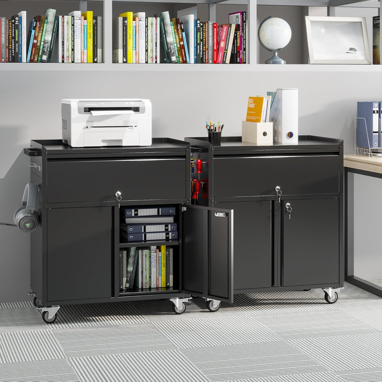 - 【Adjustable Shelves】This metal storage cabinet with wheels and one adjustable shelf and 1 drawer. The shelf can be moved guaranteeing maximum adaptability and convenience for your unique storage and organizing needs.
