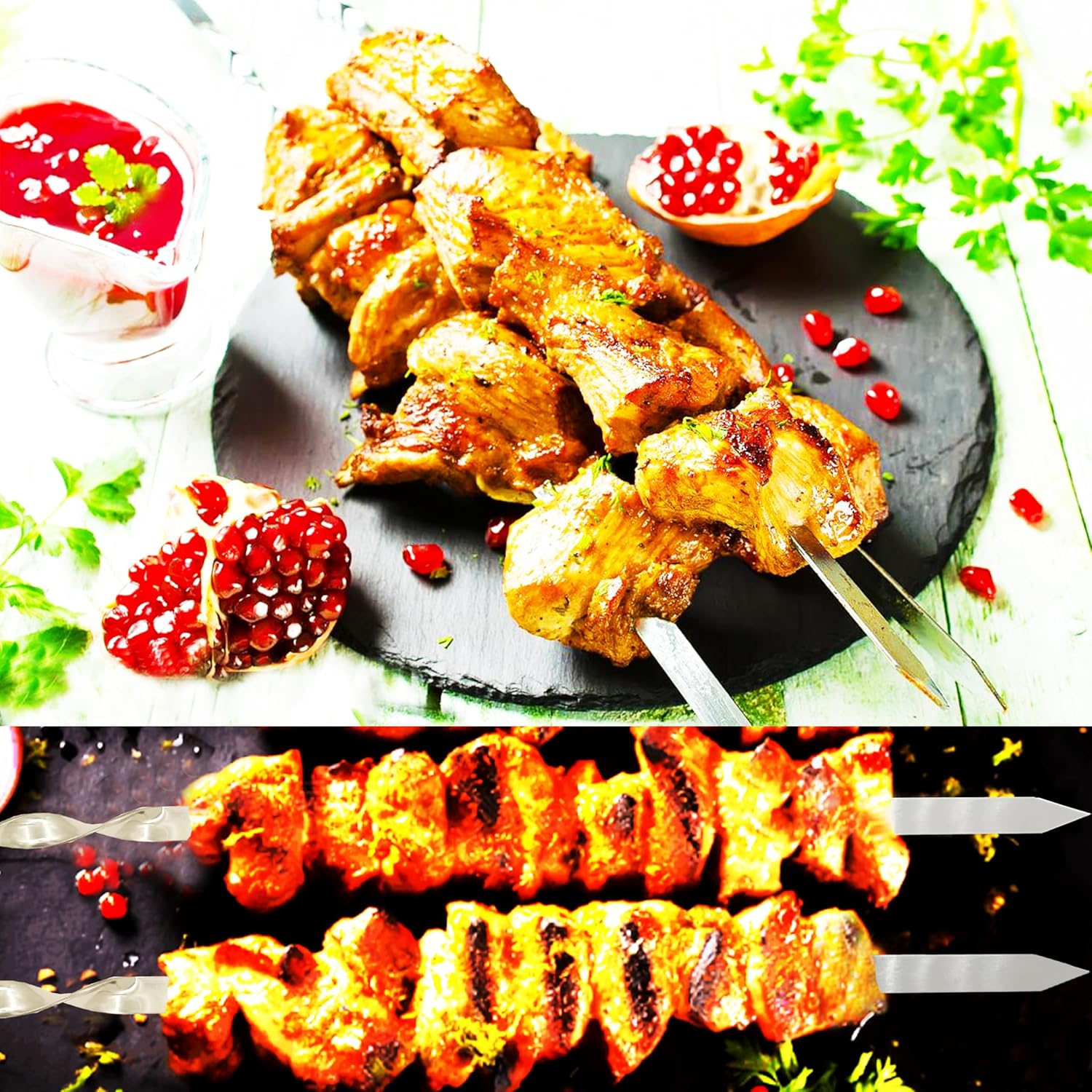 - 【HIGH QUALITY】Shish kebab is made by premium quality rust-proof and heat-resistant food-grade 430 stainless steel,Kabob skewers are durable and reusable.Eco-friendly.Well polished and smooth surface,the food residue will not get stuck on the kebab blade,and easy to clean.Anti-corrosion BBQ skewers shashlik sticks ,can be used for a long term.Very thick and hard,can withstand Heavy food on it, will not get bent or twisted.