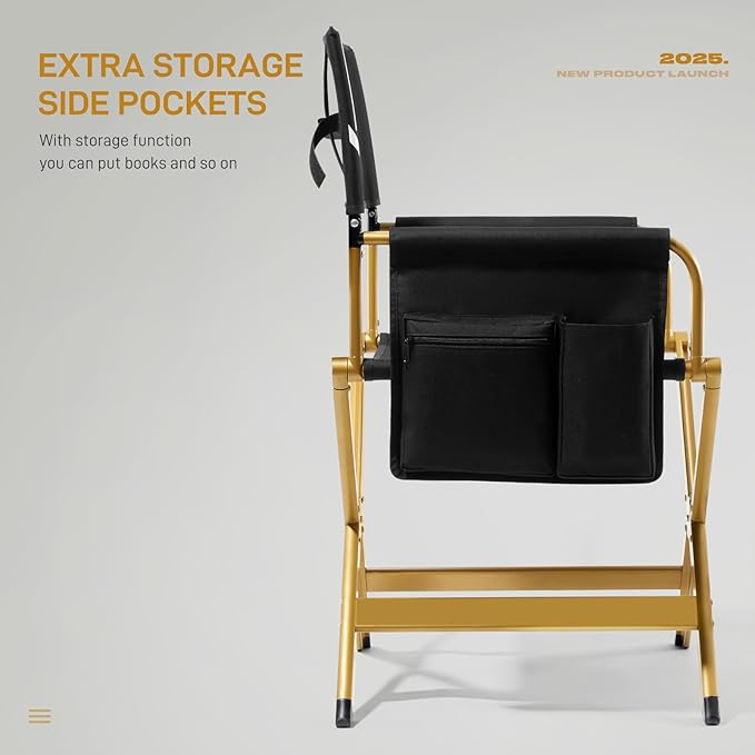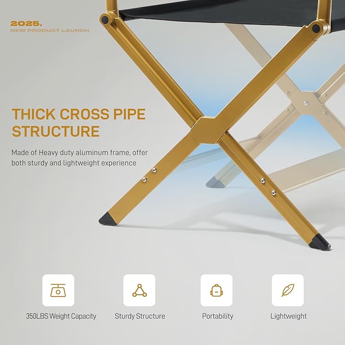 EVER ADVANCED Aluminum Directors Chair, Folding Studio Movie Chairs Camping Event Vendor Chair, 19" Seat Height Black Fabric/Golden Frame, Support 350lbs