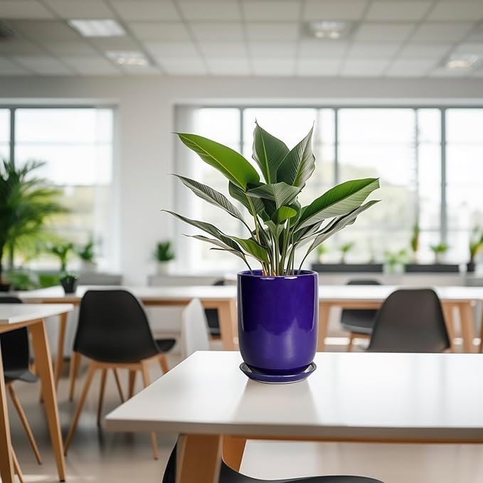 Ceramic Plant Pot - 8 Inch Planter for Indoor Plants Outdoor Flower Pot with Drainage Hole and Saucer Home Patio Office Decor Blue