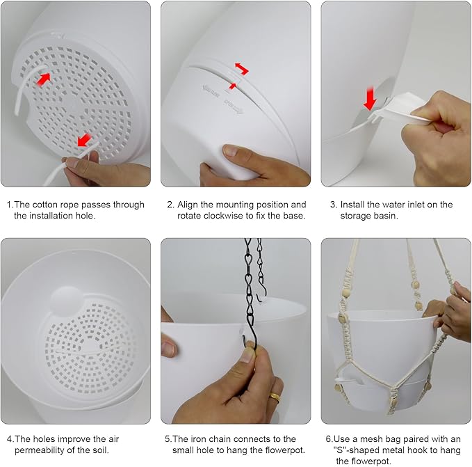 • 【Self-Watering Hanging Planter with Removable Tray】This hanging flower pot comes with a detachable bottom tray that acts as a water reservoir, holding a good amount of water. When your plant needs water, it’s absorbed through cotton wicks from the reservoir to the soil, reducing how often you need to water
