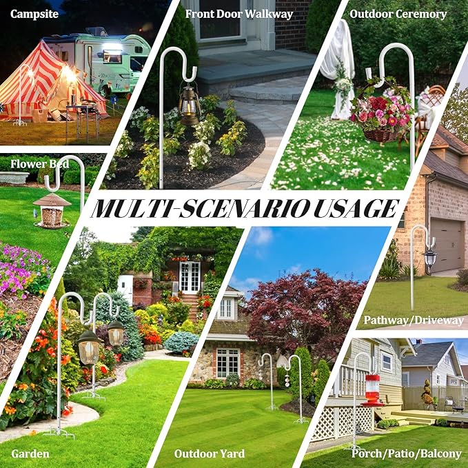 - All-Season Versatility for Every Outdoor Occasion:More than just for bird feeders! Use this garden hook to hang seasonal decorations like flower baskets in spring, solar lights in summer, Halloween lanterns in fall, or wreaths at Christmas. Ideal for Outdoor yard, garden, flower bed,front doors, patios, walkways, and even campsites.