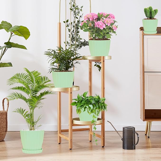 5 Pack Flower Pots for Indoor Plants, 6 inch Plant Pots Outdoor Planters for Porch Garden Office Home Decorative Holiday with Drainage Holes and Saucers, Plastic Planter Nursery Pots Green