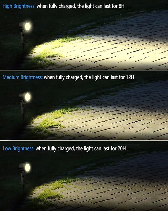 - 2700K Warm Light & 3 Brightness & 3 Modes: 2700K warm light of solar spotlights outdoor can provide warm and relaxed light, which is very suitable for creating a romantic and beautiful atmosphere in the courtyard. 3 brightness and 3 lighting modes(Static/Strobe/Breathing Mode) can be adjusted