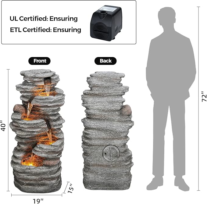 40" Outdoor Water Fountain with LED Lights - 5-Tier Cascading Rock Waterfall Fountain, Natural Rock Look, Ideal for Garden, Landscaping, Patio, Balconies and Yard Decor