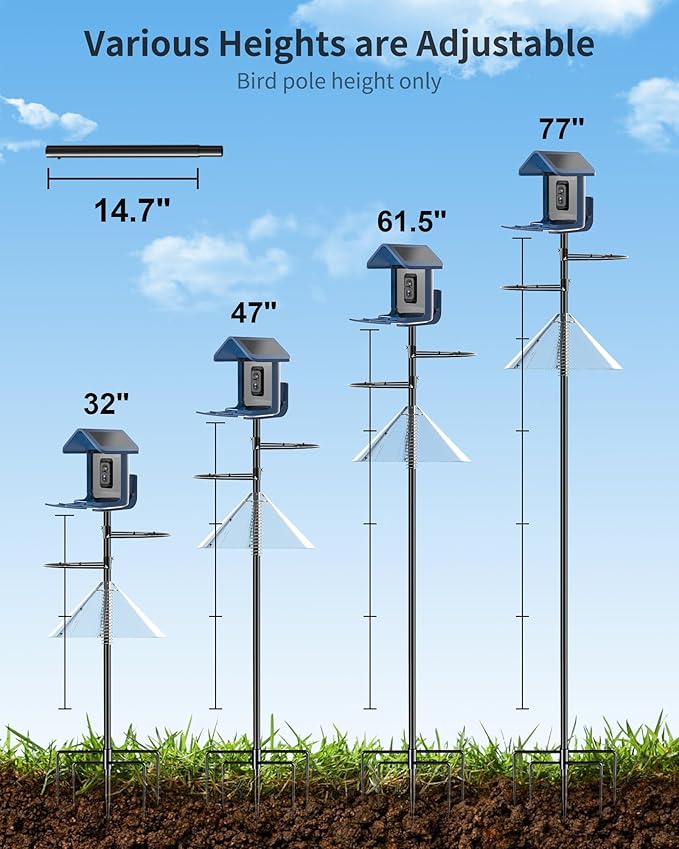 - 【Pole for Long-Lasting】The 5-prong base features a reinforced weld design for solid ground support, preventing breakage and ensuring durability. The thicker pole, 1-inch diameter and 1mm thickness, connects via a slip-in method for a depth of up to 5.5 cm between poles. This design is much stronger than the 1cm threaded connections, offering improved resistance to bending and breakage. It provides ample weight capacity, perfect for enduring storms, winter snow, and multiple bird feeders.