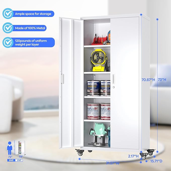 - Large Storage Space: Steel garage storage cabinets H73 x W31.57 x D15.71 inch , Perfect for use in homes, offices, garages, schools, shops, warehouses or other commercial spaces,removing the wheels creates a new cabinet