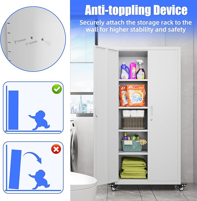 - Detachable Swivel Wheels with Lock: Metal storage cabinet with wheels has 4 lockable wheels,you can move them around as needed and The wheels are lockable and detachable and you can fix the cabinet where you want to place