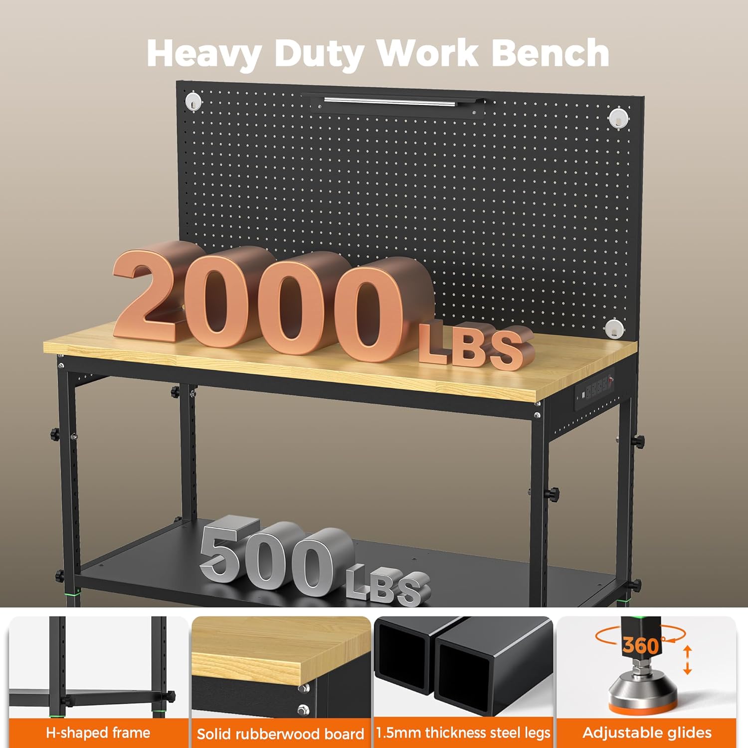 48" Heavy Duty Work Bench Adjustable Height Max Load 2000 LBS with Storage Shelf for Garage Workbench, Rubberwood Tabletop with Pegboard, LED Light, Built-in Power Strip for Woodworking Shop