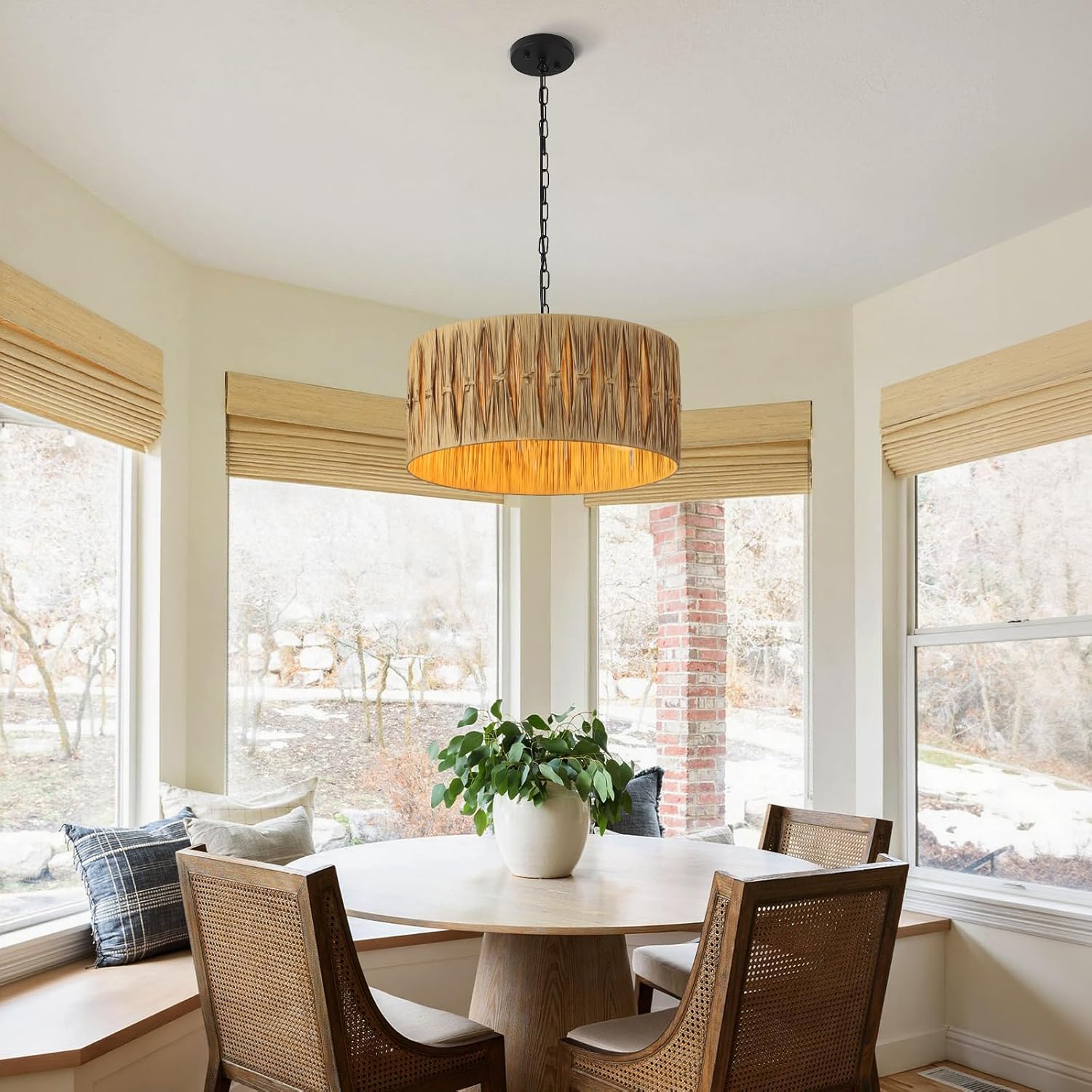 - Unique Boho Chandelier: Our dining room chandelier is crafted from handwoven raffia. With a distinctive design that merges artistic flair and modern sophistication, each piece transcends functional lighting to become a captivating decorative centerpiece