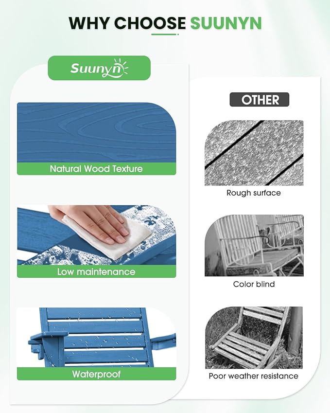 - Weather-Resistant: Made of high-quality HDPE material with wooden texture, SUUNYN sturdy adirondack chair offers excellent weather resistance, resisting fading, splitting, cracking, chipping, peeling, and rotting in harsh conditions. Plus, its easy-to-clean surface and low maintenance