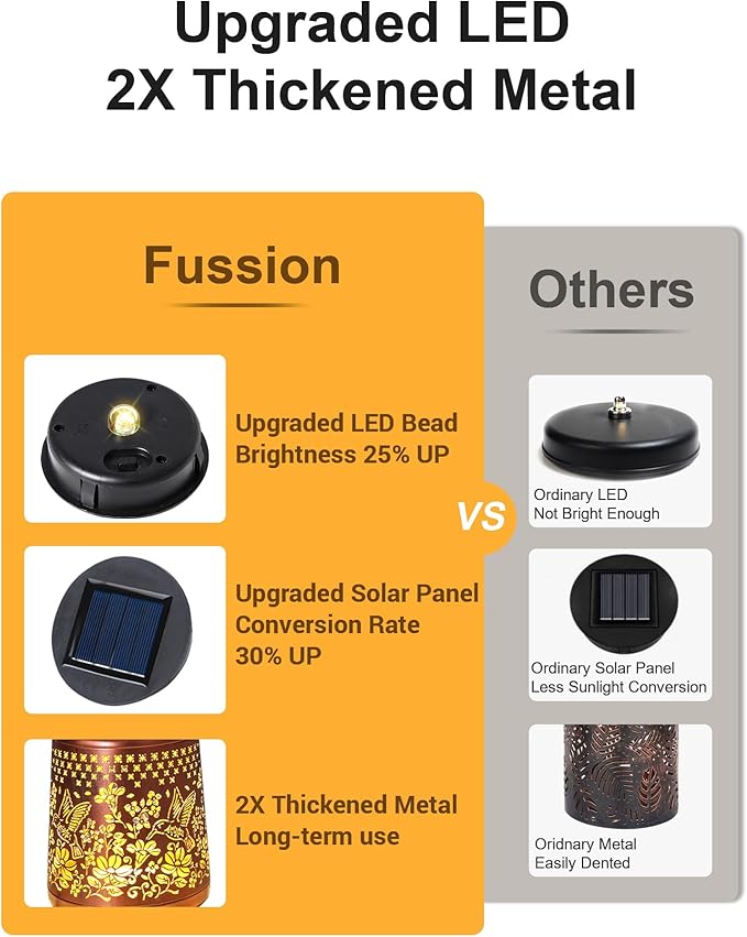 - 【Enhanced Brightness and 2X Thickened Metal】- Enjoy brighter and more vivid illumination with upgraded LED bead that provide 25% more brightness than traditional models. The delicate hollow out metal veneer ensures the hummingbird pattern is displayed with stunning clarity. Made from 2X thickened metal, these solar lanterns for porch are built to last, offering exceptional durability and resistance to bending or denting. Additionally, the solar panel power efficiency has been improved by 30%, improve energy conversion for longer lighting time.