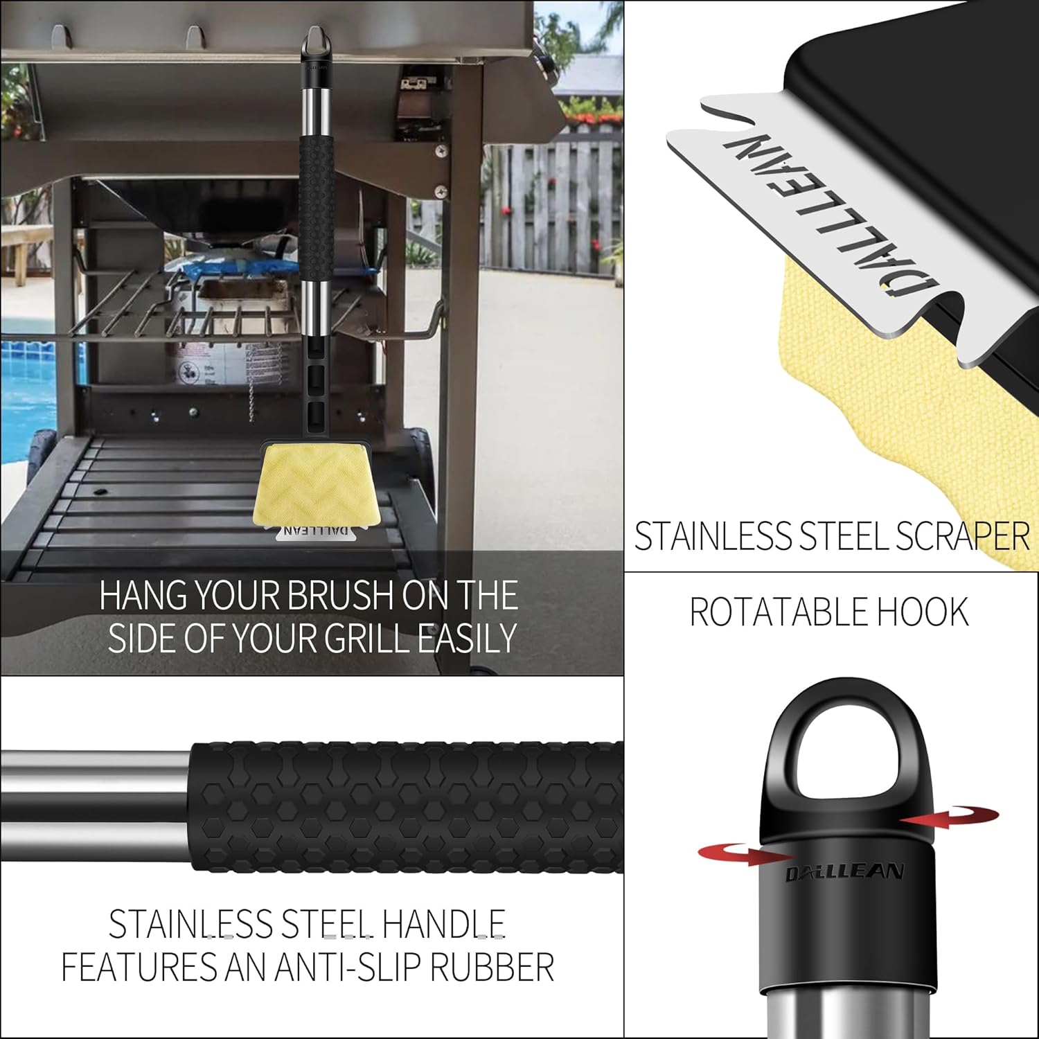 - 【Trapezoid-Shaped Design Sponge Grill Brush Head 】Keep your grill clean and safe with the DALLLEAN bristle-free grill brush. The sponge head is made of heat-resistant foam and wrapped in a high-temp fabric, unlike wire grill brushes, no dangerous metal bristles will end up in your food.