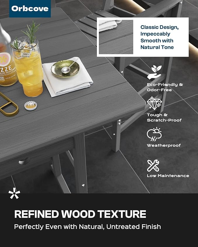 - Durable All-Weather Design: (Please note!!!Your order consists of two or three separate packages, which may be delivered at different times.) Crafted from HDPE with a natural wood grain finish, Orbcove bar table and chairs set withstands sun, rain, and wind without fading or cracking. Ideal for deck furniture, backyard furniture, or porch furniture, it’s perfect for year-round outdoor living.