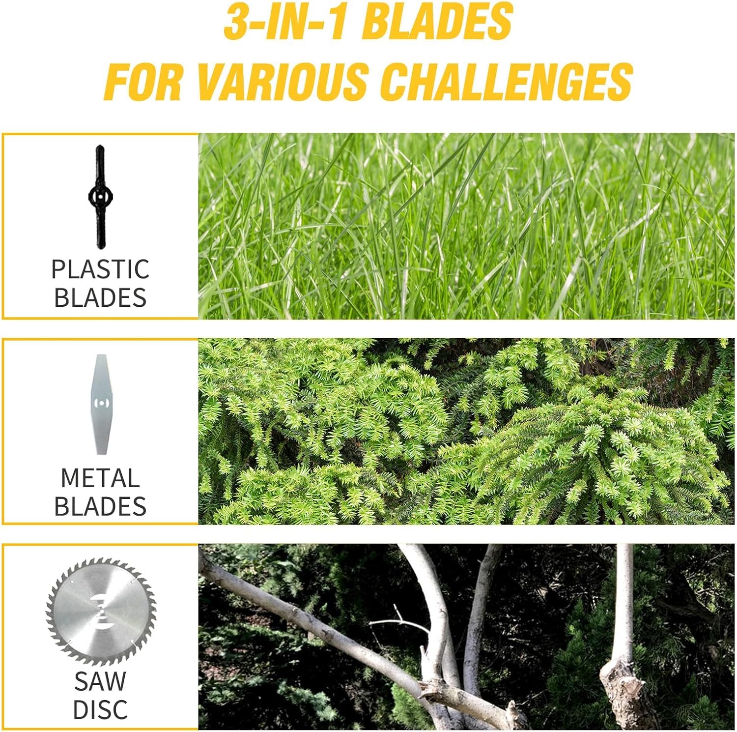 - Multifunctional Brush Cutter: Cordless Weed Wacker with 3 Blades for Different Scenarios. Metal blade suitable for cutting thick weeds and hedges; Saw blade suitable for pruning branches or bushes; Plastic blades are best for tender grass only, for lush garden grass, we recommend using the metal blade directly