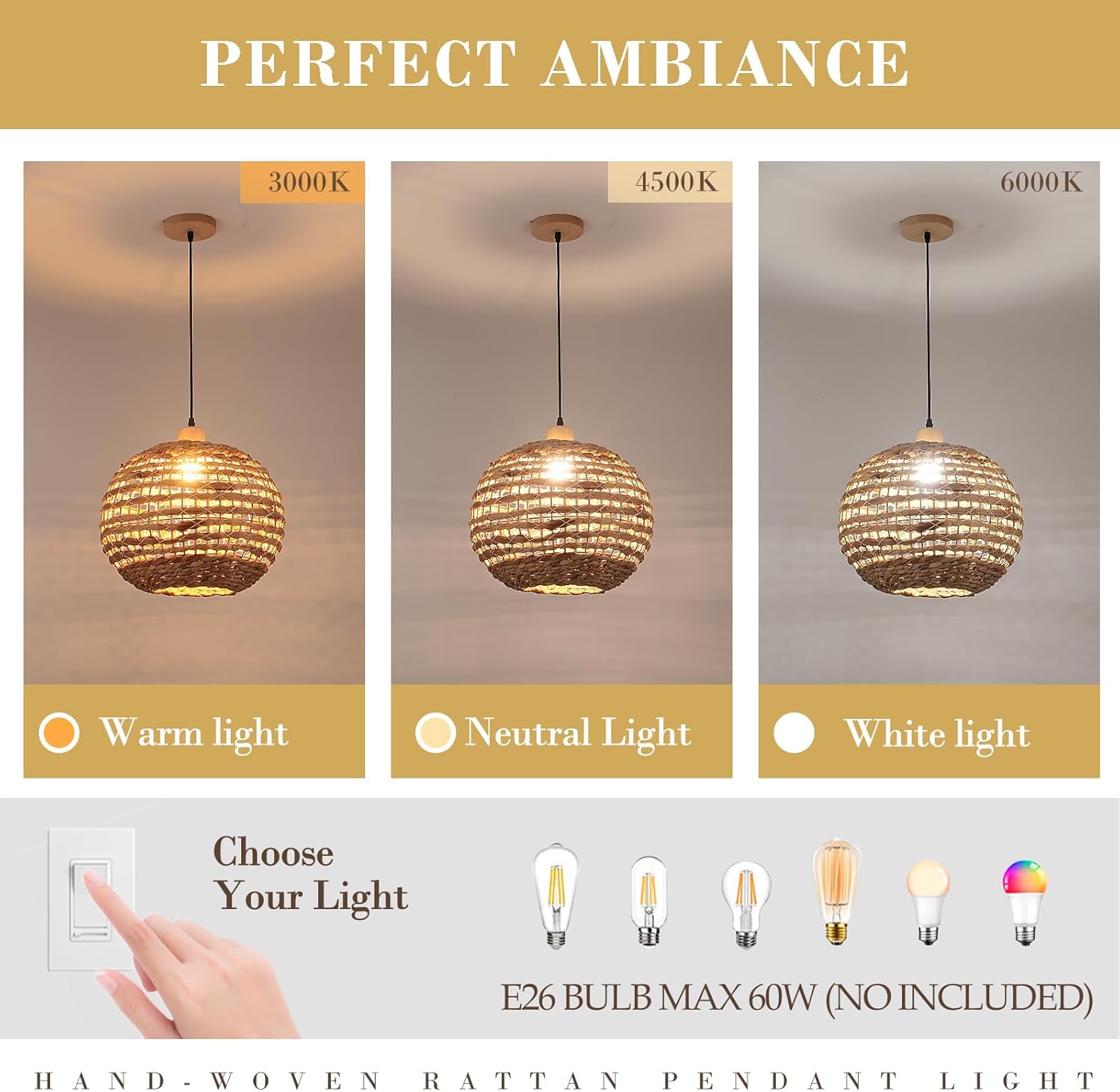 - ⭐【Wide Application】This rattan pendant light is made of delicate rattan woven, high-quality wires and thickened ceiling panels, which is perfect for farmhouses, dining rooms, kitchens, living rooms, bedrooms, hallways, cafes, bar, entryway, etc.