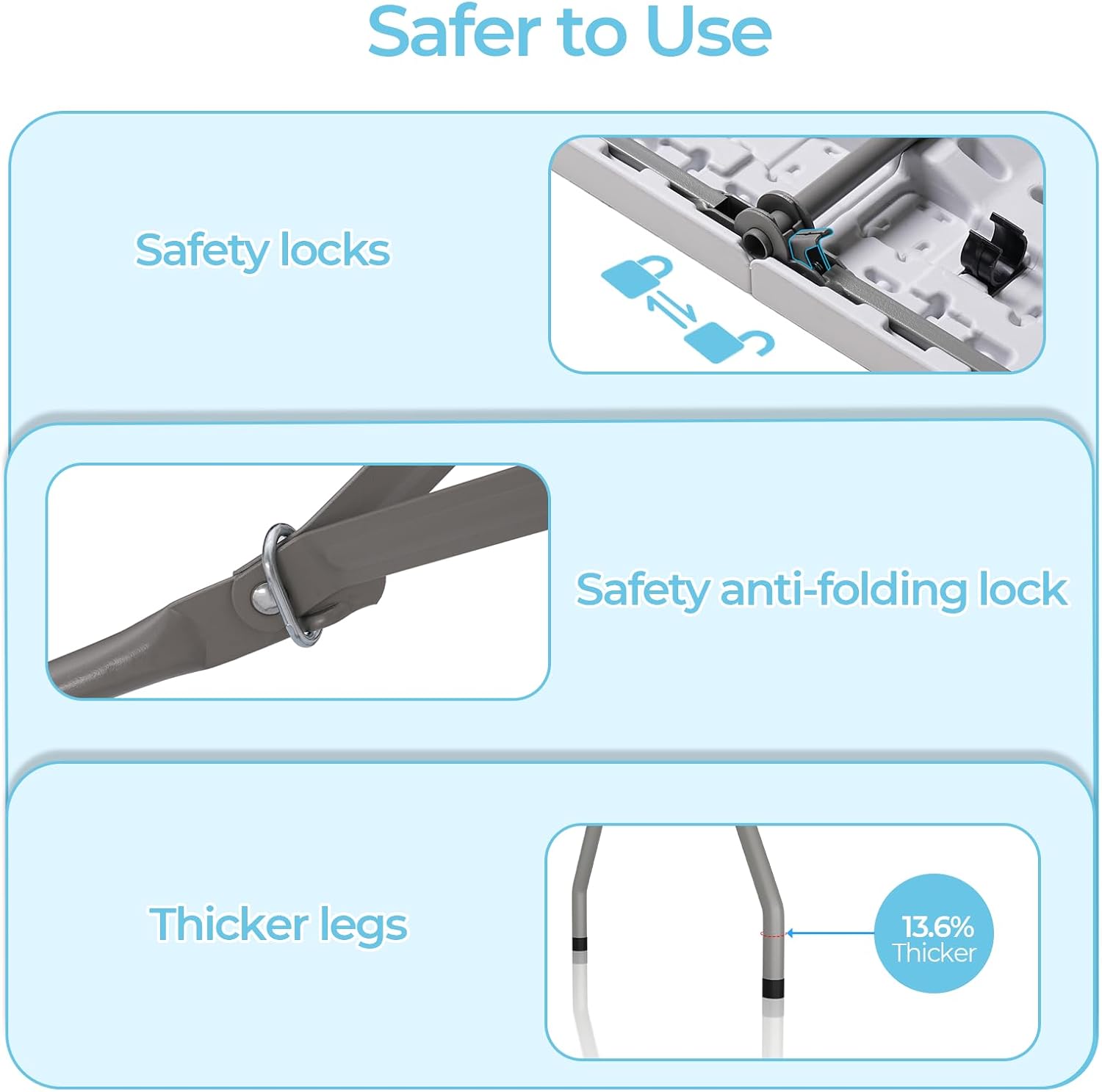- Safety Lock: Equipped with a metal safety lock at the table's folding joint, the safety lock will automatically lock when the table is opened and stay securely locked. The legs of the foldable table are designed with fixed locks to prevent folding when opened to ensure safe use.
