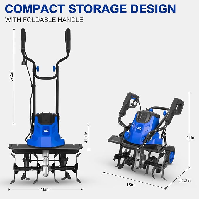 - Foldable and Portable: Weighing only 23.48 lbs, the tiller is lightweight and easy to transport. Equipped with 4 quick knobs and an H-handle, it is designed for convenient storage.