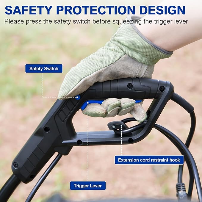- High-Performance Motor: This corded tiller with a 14A motor achieves speeds of up to 19,000 RPM, efficiently tilling soil that is 18" wide and 8" deep.