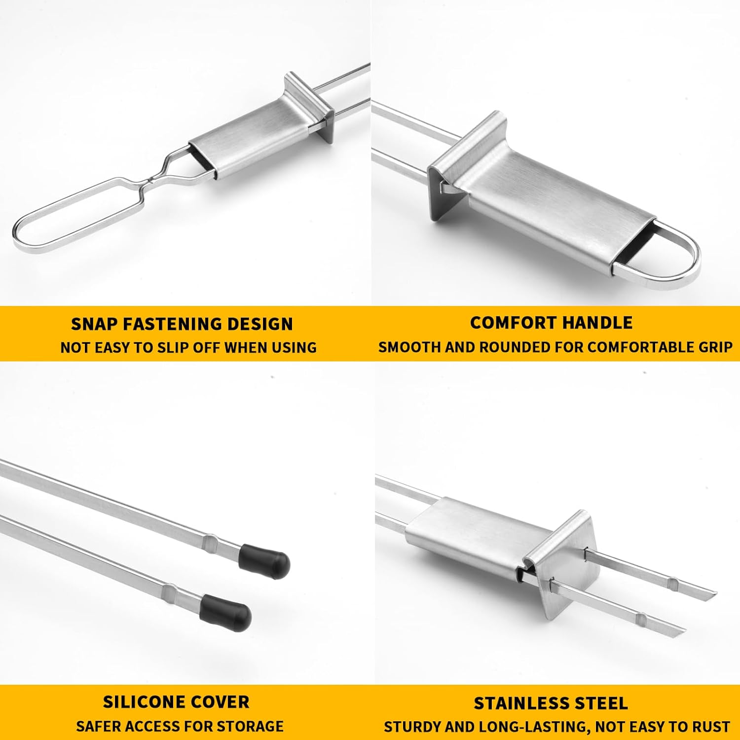- Ergonomic Heat-Resistant Handles & Anti-Slip Design: Flat, textured handles stay cool during grilling and provide a secure grip. No more burnt fingers! The tapered tip ensures smooth threading of meats, veggies, and even delicate shrimp