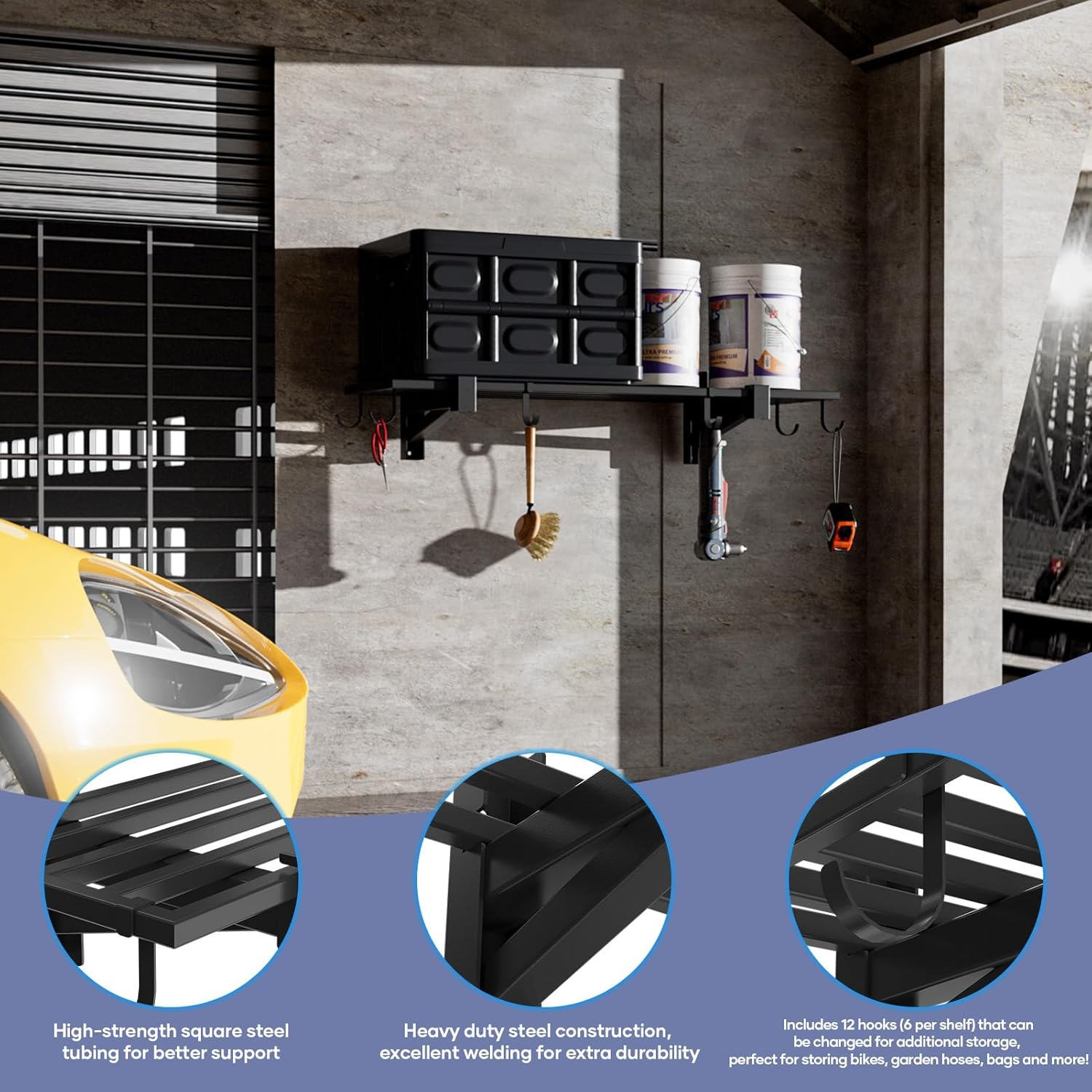 2-Pack Garage Wall Shelving, Heavy Duty Garage Storage Shelving With Hooks, Shelving Wall Mounted Holds 250 lbs Each,Black