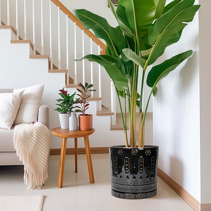 Ceramic Pots for Plants - 12 Inch Large Planter with Drainage Hole and Saucer, Ceramic Flower Pots for Indoor Outdoor, Boho Round Planter, Patio Decor, Gifts for Plant Lover, Black