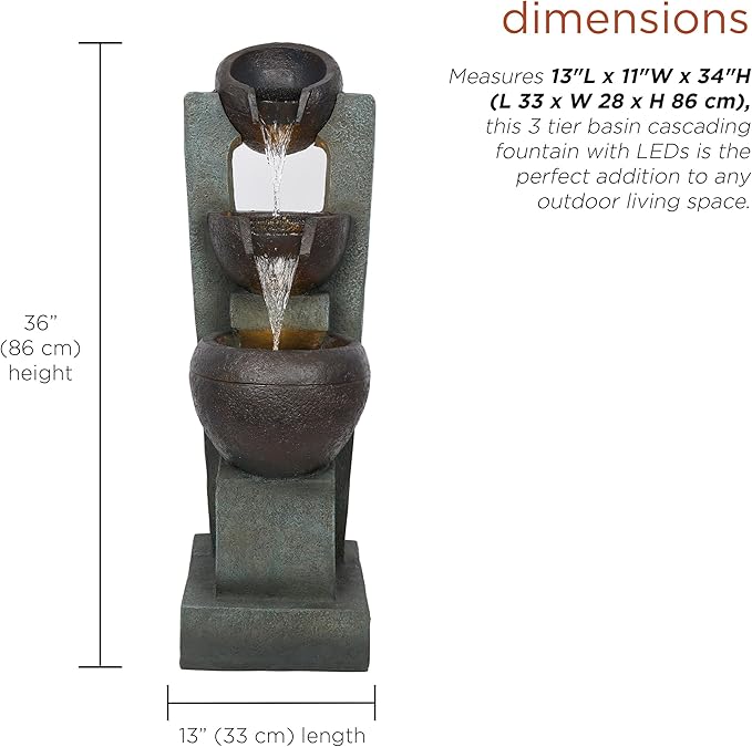 - 34" 3 TIER BASIN CASCADING FOUNTAIN – This elegant 3-tier basin design creates a peaceful cascade of water, flowing gracefully from one level to the next, adding tranquility and charm to your garden, patio, yard, or any outdoor space for an inviting atmosphere.