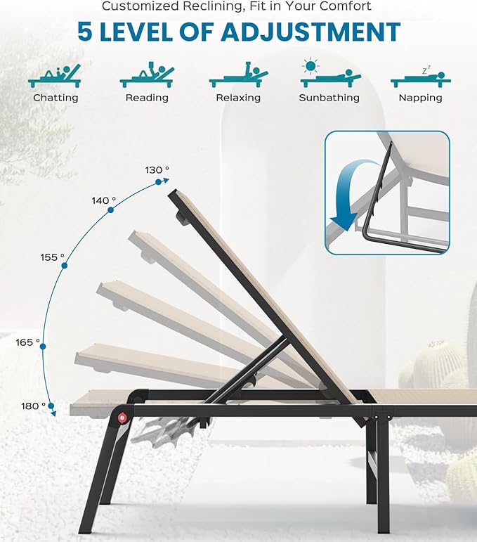 - 5-Position Adjustable Backrest –Experience ultimate comfort with our patio lounge chair’s five recline options. Whether you’re reading, napping, or simply relaxing, adjust the backrest from upright to fully reclined to find your perfect angle