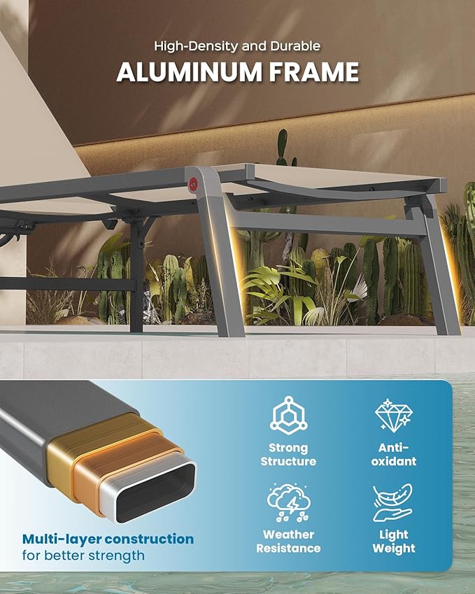 - Rust-Resistant Aluminum Frame – Built with a durable aluminum frame covered in an anti-rust powder coating, this pool lounge chair withstands outdoor elements. Its robust design provides longevity and low maintenance for carefree outdoor relaxation