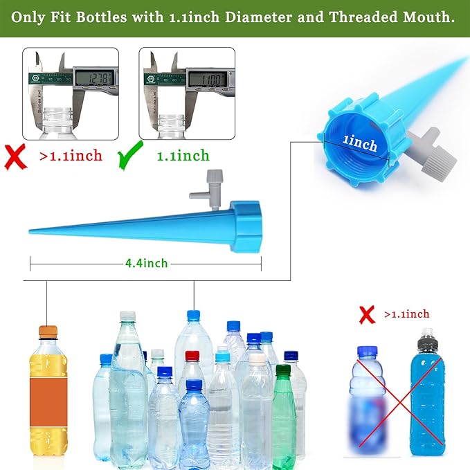 - 【Fit These Bottles】 Fit These Bottles: These self-watering spikes work with most beverage bottles that has an inner diameter of 1.1 inches. They are not appropriate for mineral water or purified water bottles(the inner diameter greater than or less than 1.1 inches).Before installing, measure the bottle's inner diameter, taking into account the thread size.