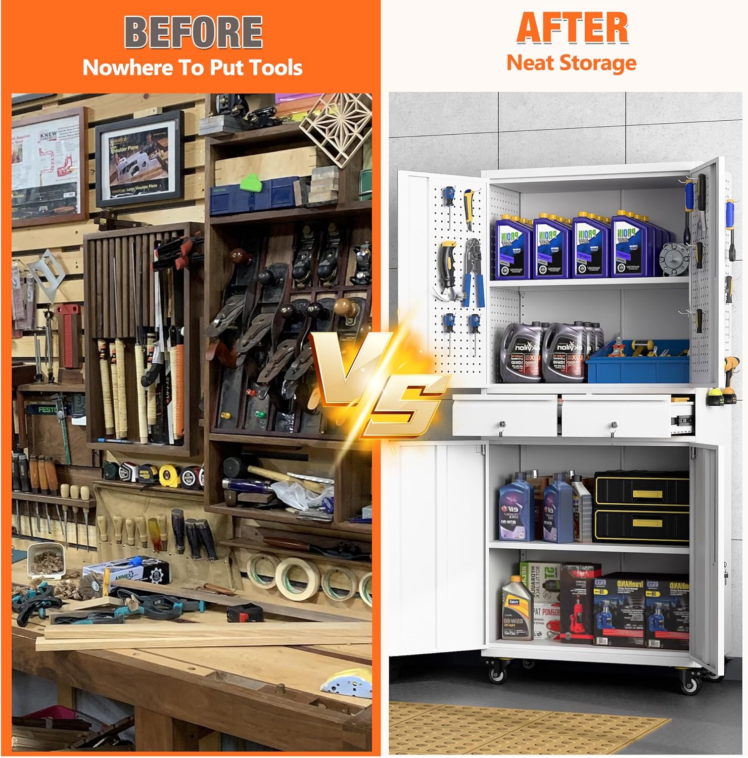 - 【Upgraded Design & More Space】 Storage cabinet offers plenty of space to meet your storage needs. There are nail boards behind and on both sides of the cabinet door. In addition to being perfect for storing large quantities of items, the metal storage cabinets outside hanging hole design adds extra space to any room