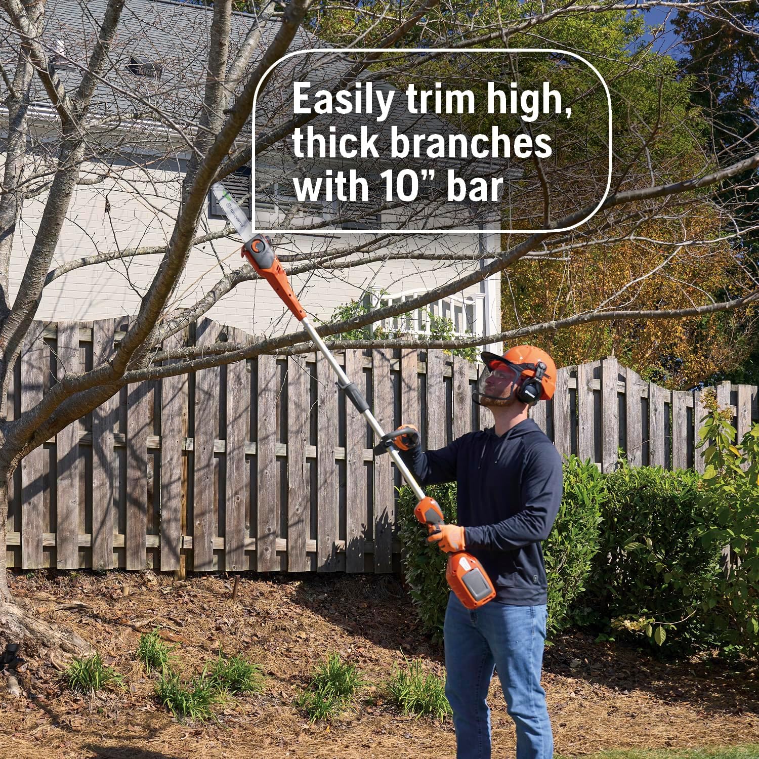 - EASY, COMPACT STORAGE: Battery pole saw attachment includes storage hook, making it easy to hang alongside other landscaping tools and lawn equipment
