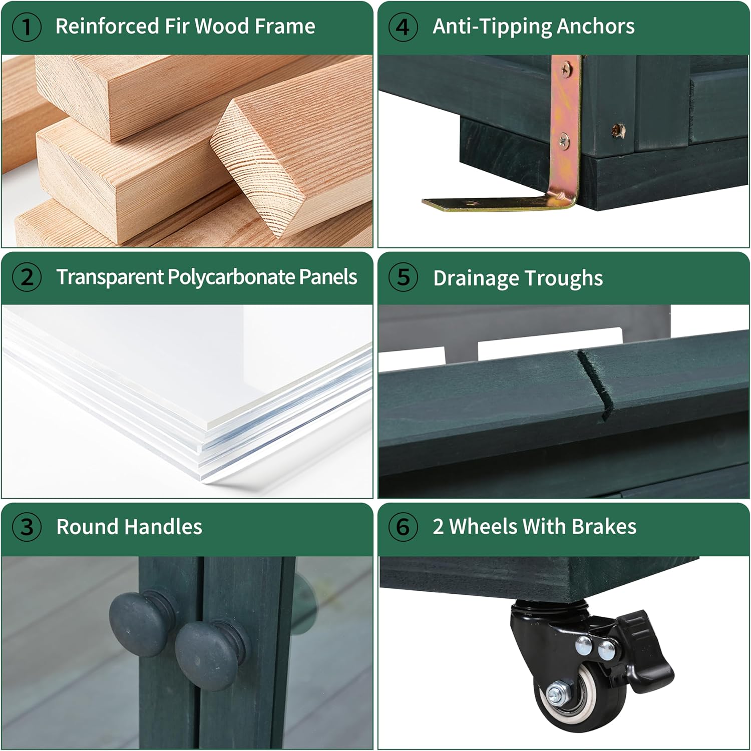 62" Wooden Greenhouse with Wheels - Adjustable Shelves Portable Cold Frame for Balcony/Patio, UV-Resistant Indoor Outdoor Plant Growing Cabinet (Large, Heavy-Duty) (Green)