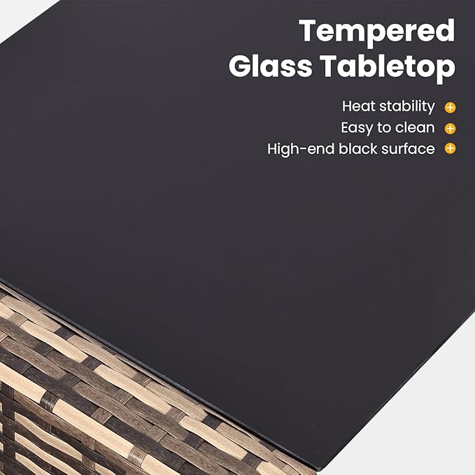 - Ergonomic Comfort:High-density foam cushions with breathable polyester covers provide lumbar support. The PE wicker is waterproof. The large, long glass top table provides plenty of space for snacks and drinks and is easy to clean. If you feel too tired to wipe the table top, you can rinse it directly with water, which is very convenient