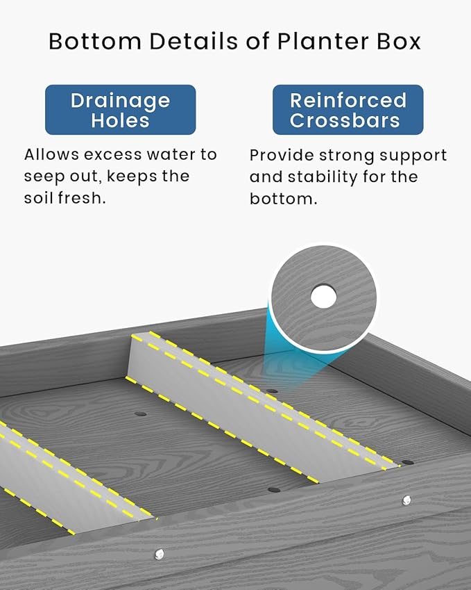 - Drainage System: This planter box is equipped with drainage holes at the bottom to allow excess water to drain out, keeping the soil fresh. Two reinforcing crossbars provide added support, preventing the bottom from detaching.