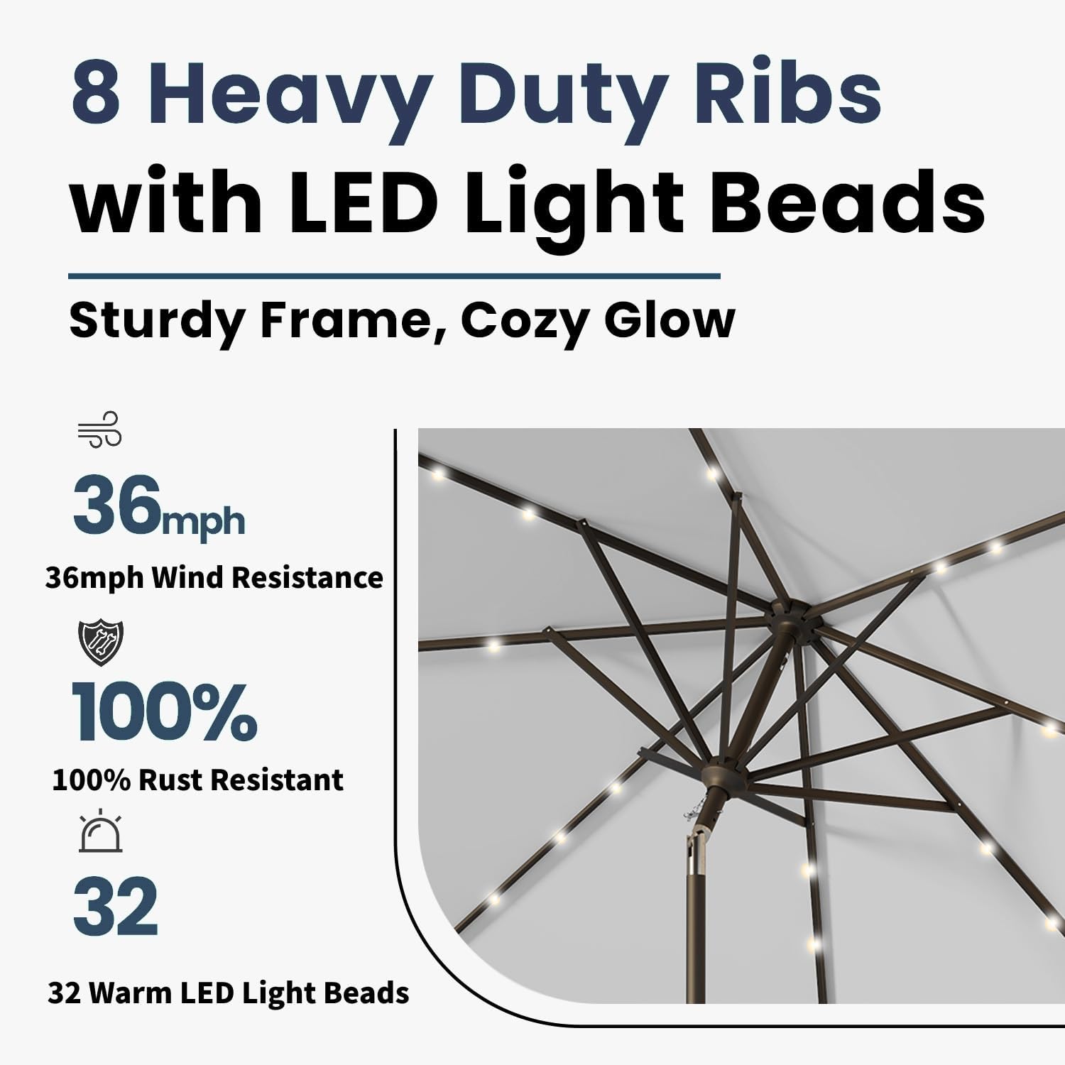 9FT Solar Umbrella 32 LED Lighted Patio Umbrella Table Market Umbrella w/Tilt and Crank, UV-Resistant Outdoor Umbrella for Pool, Garden, Deck, Light Gray