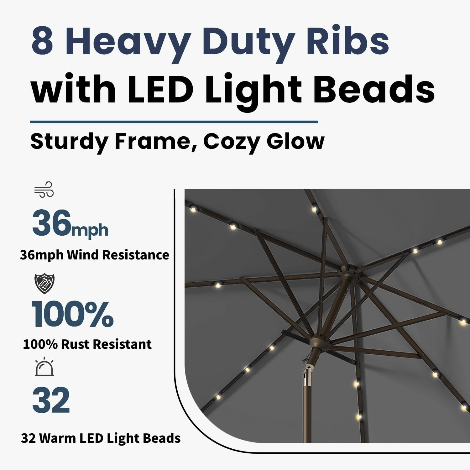 - 32 Solar-Powered LED Lights: Illuminate your evenings with 32 built-in LED lights powered by a high-efficiency solar panel, without the need for external power sources, providing up to 8 hours of ambient lighting.