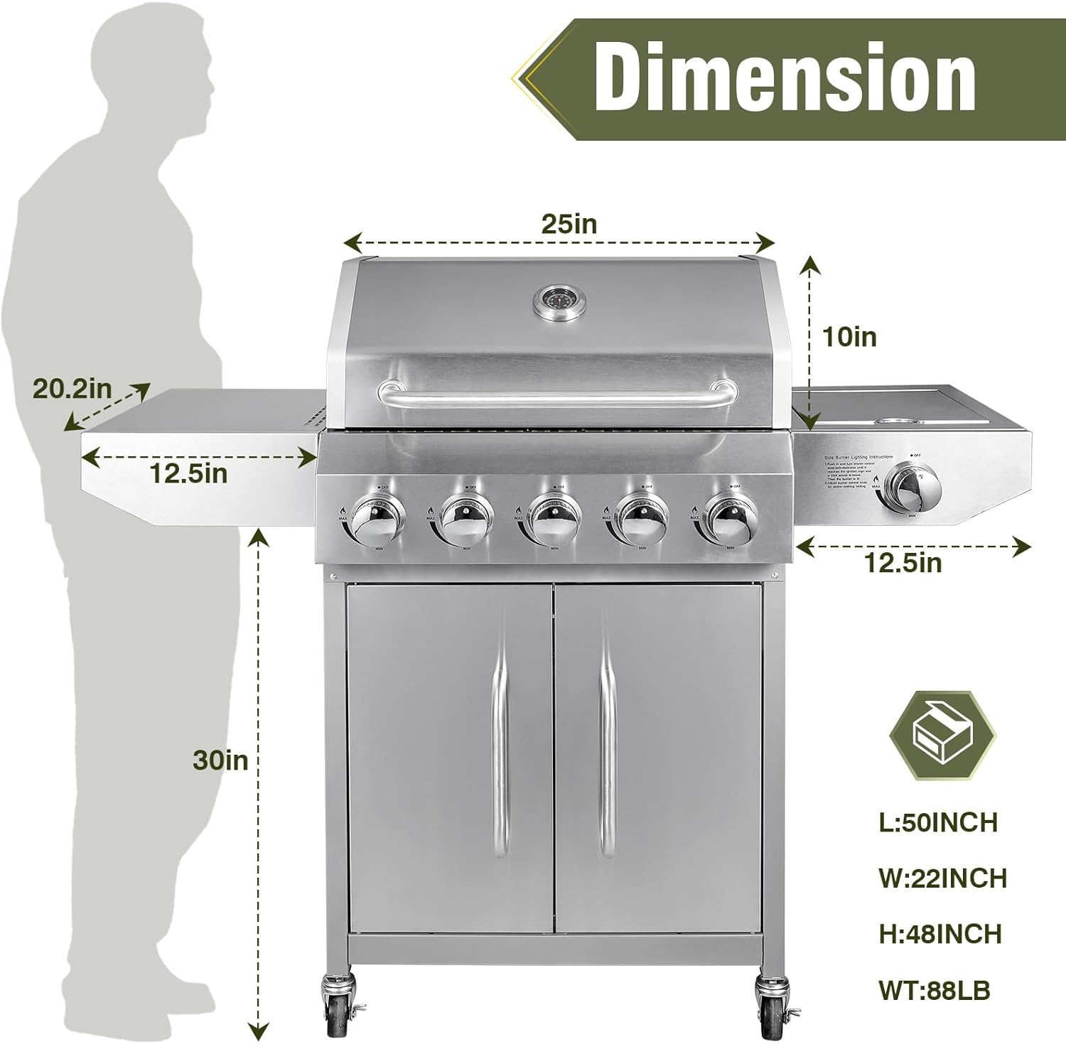 Bestfire 68,000 BTU 5 Burner Propane Gas Grill with Side Burner-Professional-Grade Stainless Steel Outdoor BBQ Grill-647 sq in Cooking Space&Porcelain Cast Iron Grrates-Patio Cart Design for Backyard