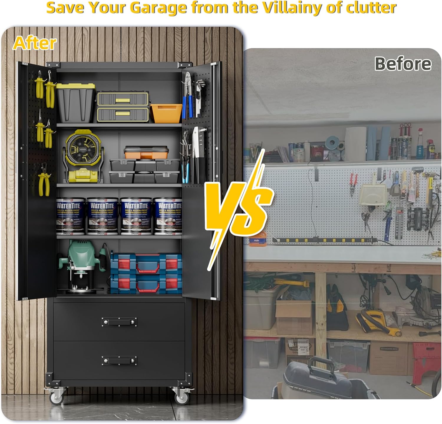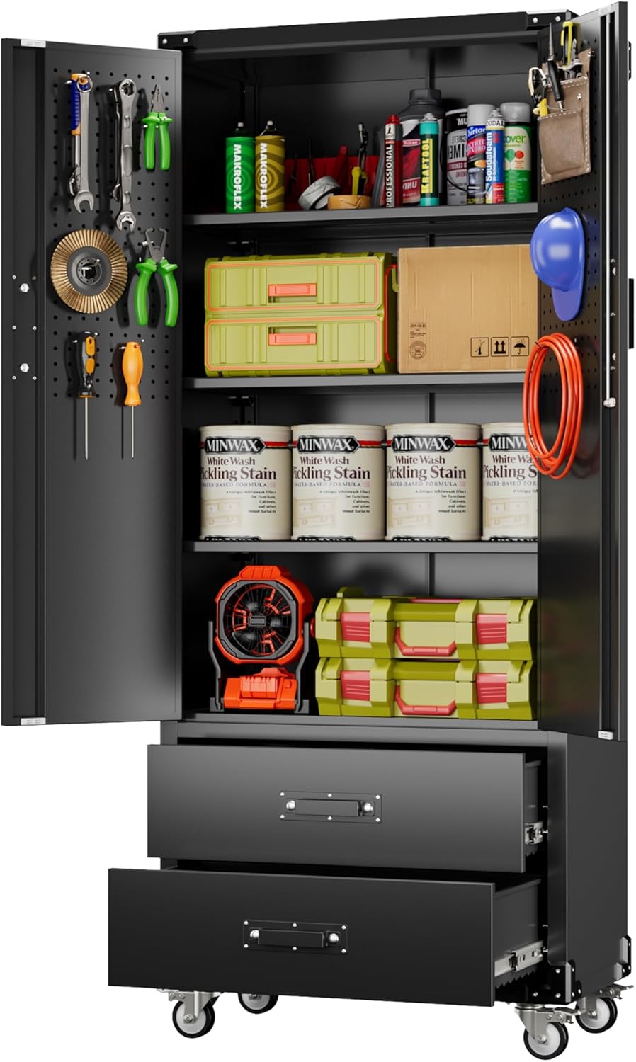 - 【Adjustable Shelves & 2 Large Space Drawer】 Garage storage cabinet has a total of 3 shelves which can be adjusted and also guaranteeing maximum adaptability and convenience for your own unique storage and organizing needs. Each shelf holds up to 120 lbs, which is perfect for storing household items, supplies, tools, documents, etc.This cabinet also have a ball-bearing full-suspension drawer that open and close quietly and easily.