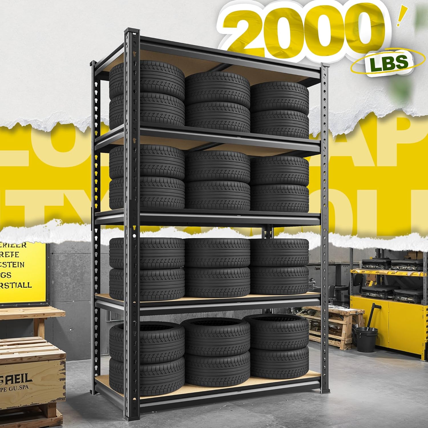 - 【2000LBS Garage Storage Shelves with Rolled Edge Design】The storage shelf is constructed from 5mm MDF and thickened metal frame. Rolled edge design of the metal column is not only thicker and better quality of the column, but also protect your hands from scratches. Each shelf with 1 rib beneath, each layer can hold up to 400LBS, with a total bearing capacity of 2000LBS