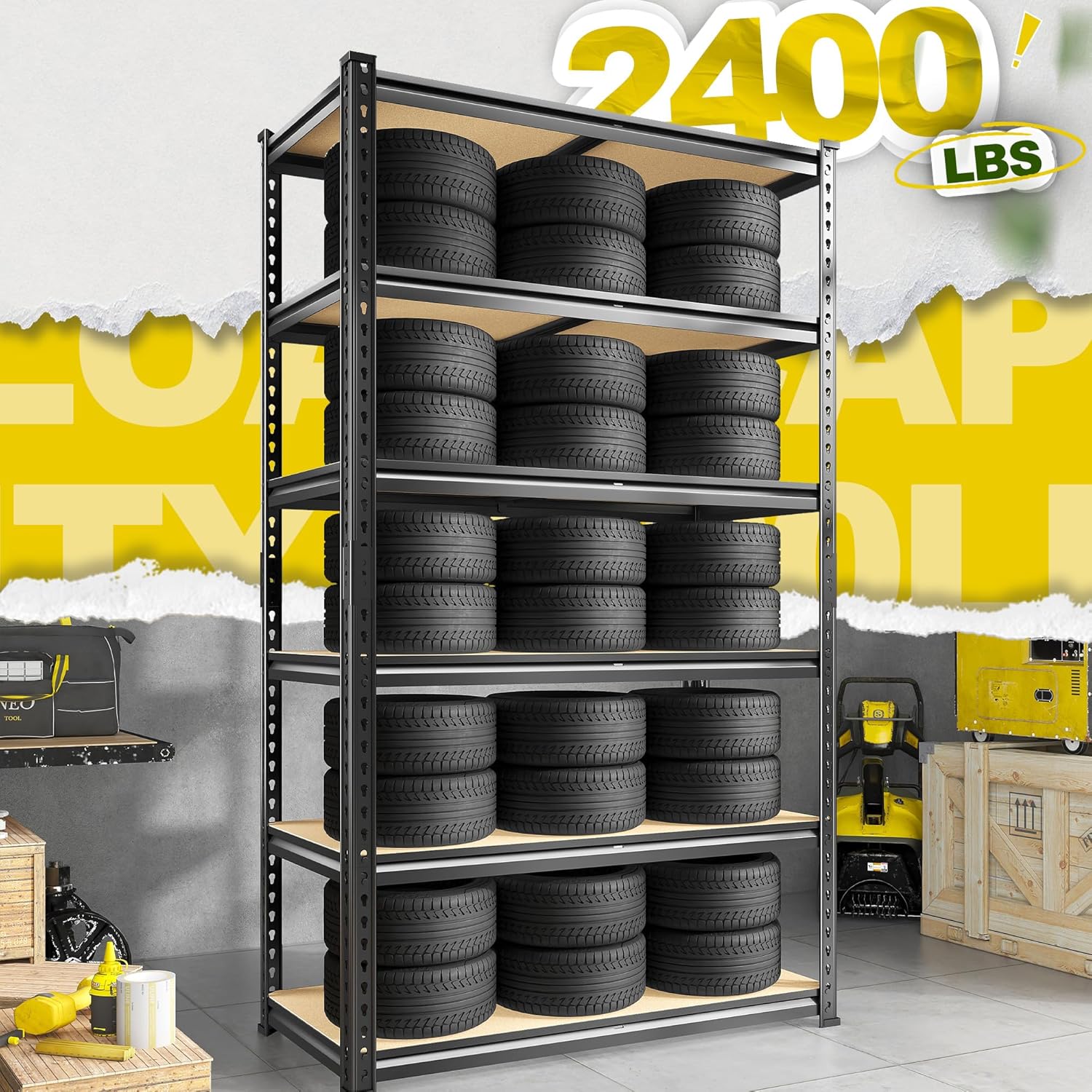 - 【2400LBS Garage Storage Shelves with Rolled Edge Design】The storage shelf is constructed from 5mm MDF and thickened metal frame. Rolled edge design of the metal column is not only thicker and better quality of the column, but also protect your hands from scratches. Each shelf with 1 rib beneath, each layer can hold up to 400LBS, with a total bearing capacity of 2400LBS. The robust design allows the garage storage shelves to stably hold various heavy items, making it easy to keep your space neat and organized