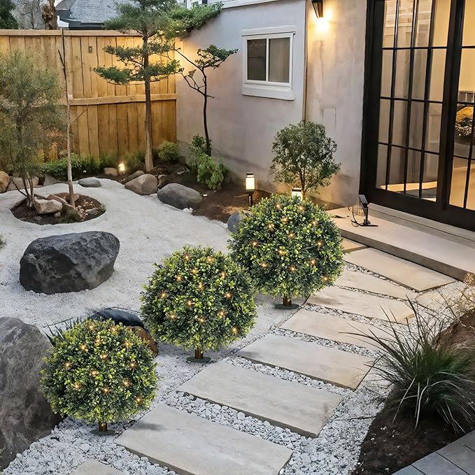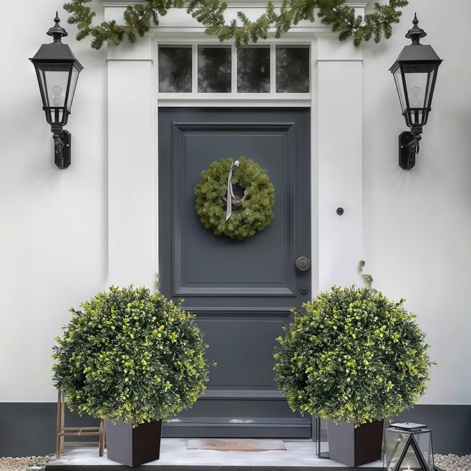 - 【2 Boxwood Topiary Balls】 You will receive 2 Boxwood Topiary Balls Artificial Outdoor, each standing 24 inches tall. These outdoor faux plants are crafted from high-density PE simulated pine needles and feature natural wood-grain trunks, with lifelike gradient green leaves and intricate detailing. The UV-resistant coating ensures vibrant color retention for 3 to 5 years, making these artificial plants outdoor nearly indistinguishable from real foliage even up close.