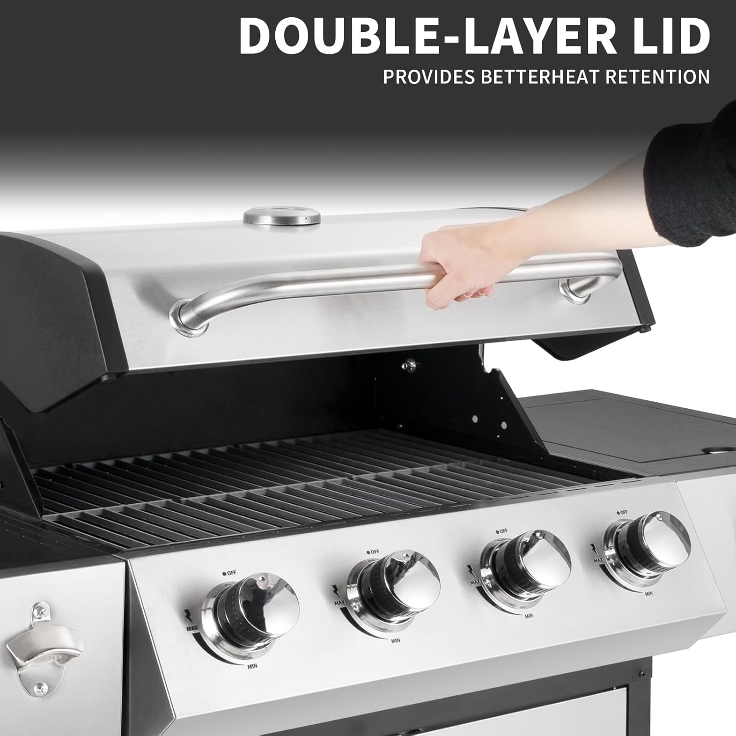 - 【53000BTU COOKING POWER】 Barbecue Gas Grill’s burner head is made of 304 stainless steel. 4 main burners and side burner Gas grills provide a total 53,000 BTU of cooking power including 44,000BTU main cooking space and 9,000 BUT side burner.