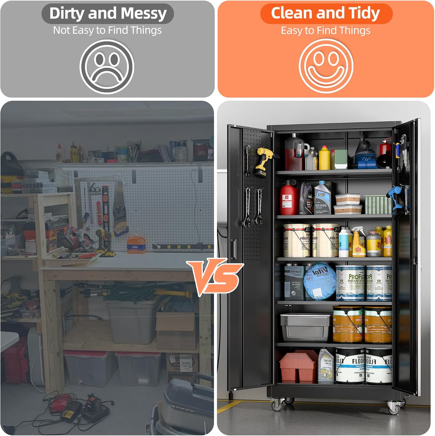 - Lockable & Safe:Steel storage cabinet is designed with 2 plastic handle, right handle with lock and 2 keys to secure your items in the cabinet
