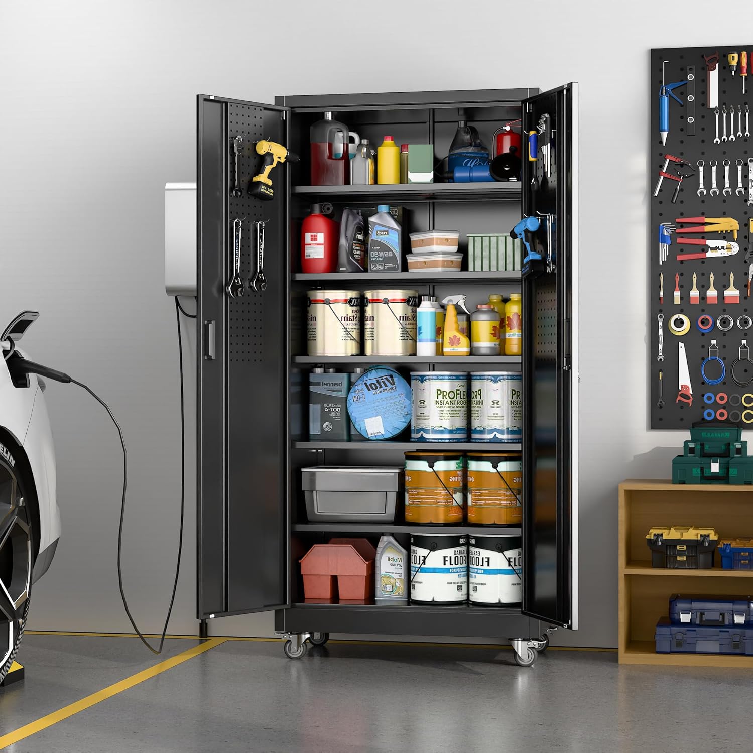 - Universal Rubber Wheels: Metal garage cabinet with wheels comes with 4 lockable universal silent casters, providing full protection for all surfaces from scratch yet easy to move around