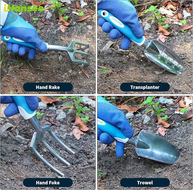 - Durable and Rust-Resistant Tools: Crafted from aluminum alloy, iHansee blue gardening tools are lightweight yet strong, offering long-lasting durability and rust resistance. Each tool has an ergonomic concave-convex handle made of PP+TPR for a comfortable grip. Designed to reduce strain on wrists and hands, the handles provide excellent leverage for digging, planting, and weeding.