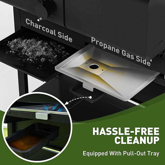 - NO FUSSY CLEANUP: Slide out the ash tray for easy cleanup of the charcoal grill, and remove the grease cup/tray for the gas grill. Full-sized, slide-out design simplifies post-BBQ cleaning