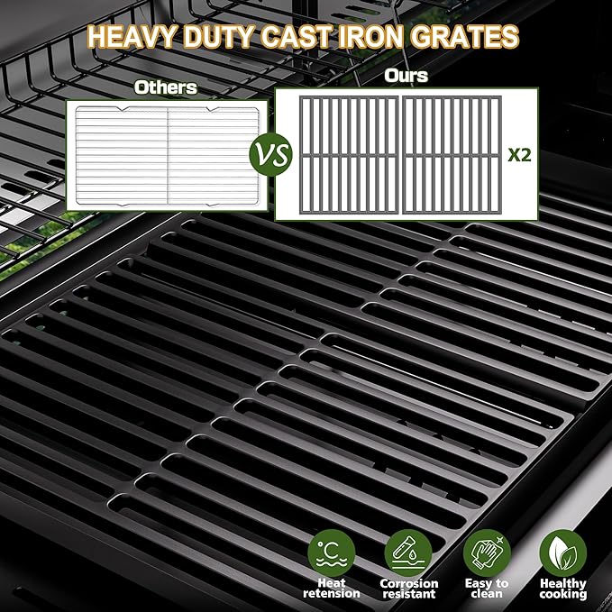 - 678 sq.in. MASSIVE BBQ SPACE: Our grill combines a spacious 472 sq.in. cast iron cooking area with a 206 sq.in. warming rack, perfect for large gatherings. Heavy-duty cast iron grates provide lasting durability and rust resistance, ensuring your grill stands the test of time